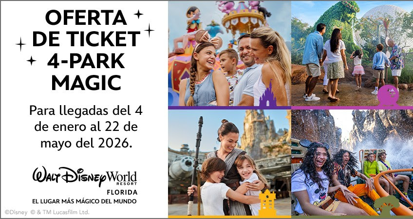 Ya está disponible la nueva entrada 4-Park Magic, que te permite visitar los cuatro Parques Temáticos de Walt Disney World Resort, un Parque diferente cada día, por un precio especial.